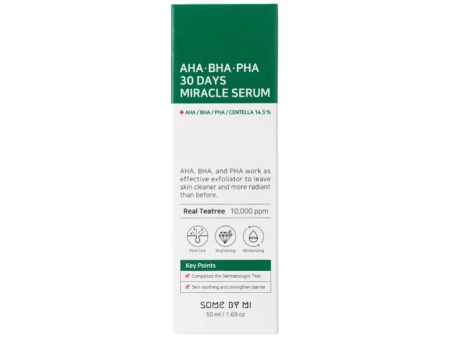Het Some By Mi AHA BHA PHA 30 Days Miracle Serum is een exfoliërend serum dat de huid kalmeert en de huidcellen stimuleert. Met 14,5% centella asiatica-extract, 10.000 ppm tea tree extracten en 3 soorten zuren (AHA, BHA en PHA) is dit serum effectief. AHA verwijdert dode huidcellen en onzuiverheden, BHA reinigt de poriën en PHA voorkomt vochtverlies. Geschikt voor alle huidtypes, zelfs de meest gevoelige. Binnen 30 dagen zie je significant verschil en zal het overgrote deel van je puistjes of pukkels verdwenen zijn.